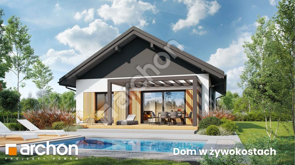 Własny taras, ogród tuż za progiem i wnętrze, w którym wszystko ma swoje miejsce – „Dom w żywokostach” to nowoczesna parterówka zaprojektowana z myślą o codziennej wygodzie. Jasna strefa dzienna szeroko otwiera się na taras, kuchnia z wyspą zachęca do wspólnego gotowania, a prywatna część domu zapewnia zaciszny wypoczynek. Jeśli marzysz o kompaktowym, wygodnym domu w cenie mieszkania – ten projekt warto poznać bliżej.