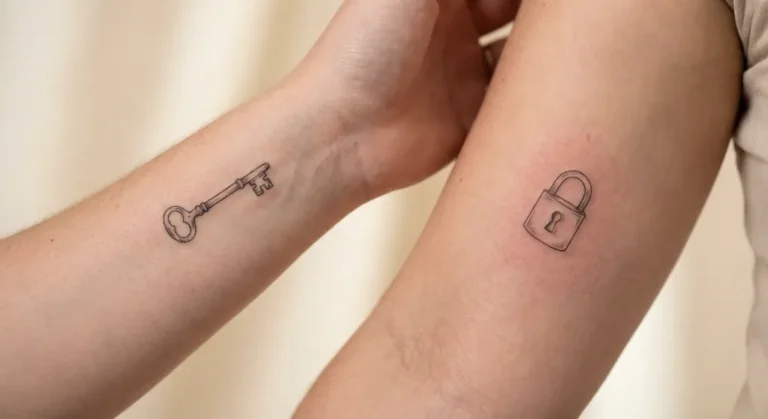 - Klucz i Kłódka: Klasyczny tatuaż klucz i kłódka symbolizuje wzajemne zaufanie, bezpieczeństwo i fakt, że jedno jest „kluczem do serca” drugiego.